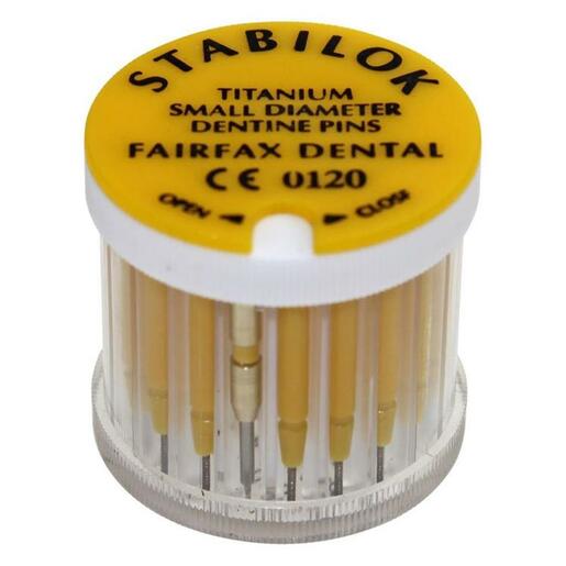 Fairfax Stabilok Titanium Dentin Pins. Self-shearing handpiece-driven dentin pins for core buildup.